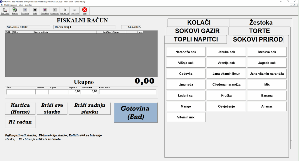 Aplikacija “PC kasa” je namijenjena za evidenciju i izdavanje fiskalnih maloprodajnih računa na različitim prodajnim mjestima kao što su trgovinske radnje, ugostiteljski objekti i slično. Jednostavno dodavanje i uređivanje artikala, izbor stavki za prodaju i fiskalizaciju računa.
